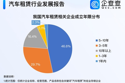 企查查數(shù)據(jù)顯示,我國(guó)現(xiàn)存96.7萬(wàn)家汽車(chē)租賃相關(guān)企業(yè)。成立年限上,我國(guó)汽車(chē)租賃行業(yè)以老牌企業(yè)為主,成立年限在5年-10年的企業(yè)最多,占比46.6%。