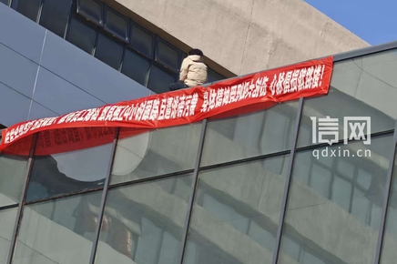 從該網(wǎng)友發(fā)來的現(xiàn)場視頻畫面中可以看到,該女子身著米色外套坐在平臺邊緣,背對樓下圍觀群眾。身下紅色橫幅上的白色字體顯示:“傳發(fā)金融高管 違法調(diào)查、散布員工隱私 致其被24小時跟蹤且遭誹謗污蔑 身體精神受到極大創(chuàng)傷 心脈俱損欲跳樓!”